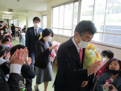 離任式の後、各教室を回っていただき、見送りのパレードです。