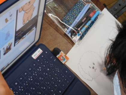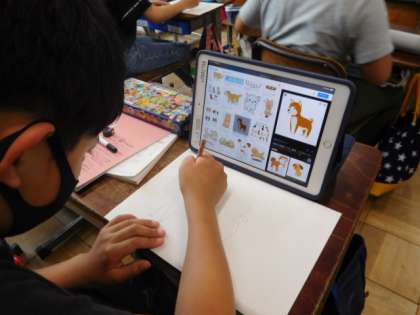 4年学活です。iPadの設定や使用方法の確認をしています。iPadで画像を選択し、それを参考に描き写しています。