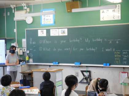 5年英語です。誕生日を聞いて、何がほしいか尋ねる英会話でのやりとりが聞こえてきます。発音もなかなかのものです。