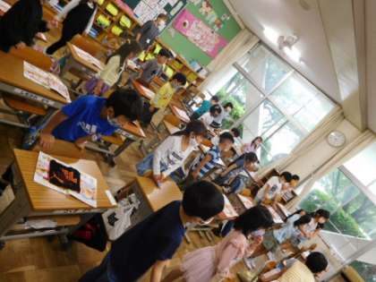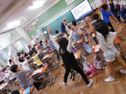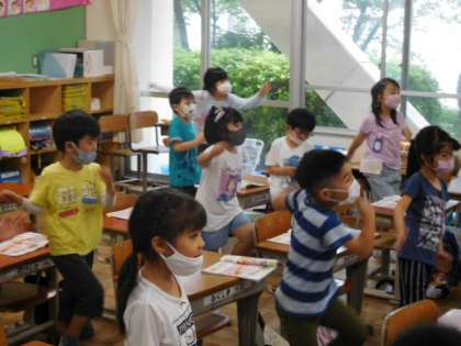 5/21(金)14 公開日 2021/05/21 更新日 2021/05/21 全校 1年音楽です。音楽の速さやリズムに合わせて体で表現しています。音楽が鳴ると体が勝手に動き出す子もいて、とっても微笑ましいです。