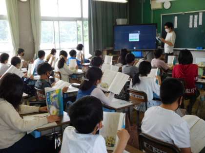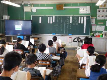 5年国語です。本論を2つに分けることがめあてです。内容を確かめるためにみんなで音読をしています。