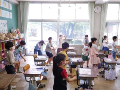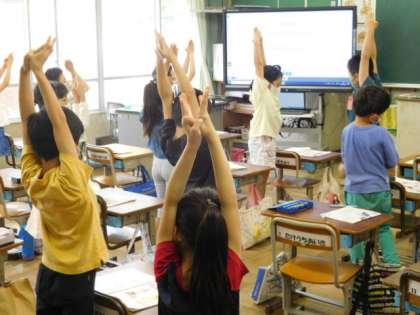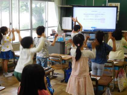 2年音楽です。音楽に合わせて振りつけをします。楽しそうに踊る姿に、つい引き込まれてしまします。
