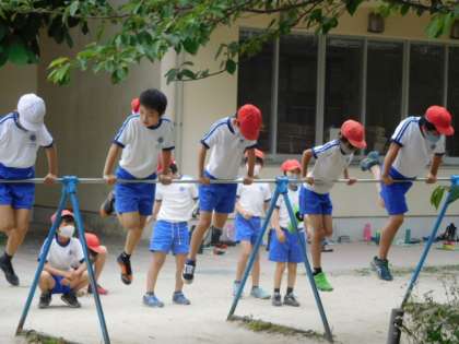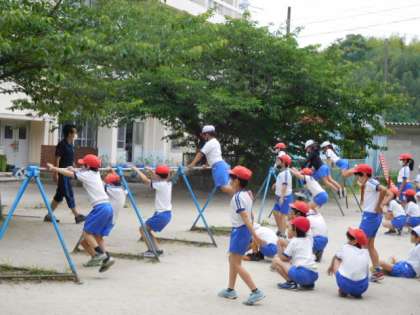 4年体育です。鉄棒の練習です。先生に指示された技を次々にこなしていきます。みんなすごい!!