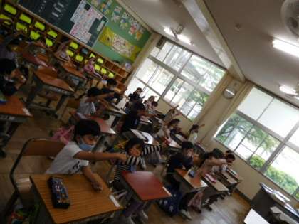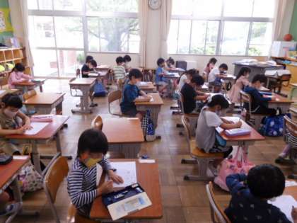 5/26(水)12 公開日 2021/05/26 更新日 2021/05/26 全校 1年国語です。「な」の練習です。4画のひらがなです。空書きを全員で行って、画数や文字の形を確認して。書く練習に取り組みます。