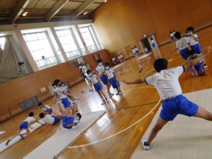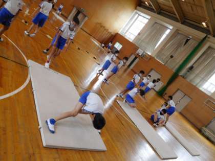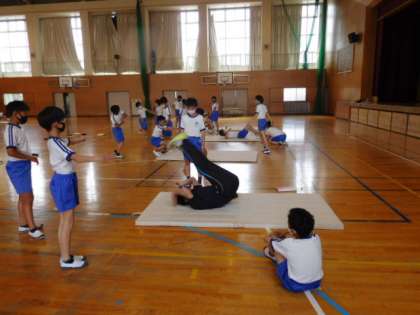 6年体育です。開脚前転、開脚後転の練習です。先生の見本を参考にしながら、何度も練習して技を極めていきます。