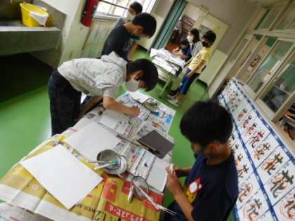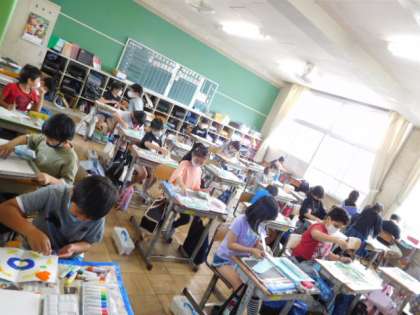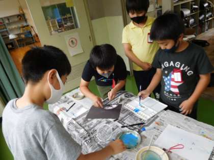4年図工です。いろいろな表現技法を使って、自分だけの模様を描いています。