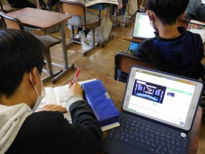 4年体育です。体育とは思えない風景ですが、今日は雨で運動場が使えないので、iPadで「鉄棒」の技を紹介している動画を見て、コツを学んでいます。次回の練習で生かしてくださいね。
