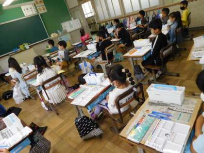 2年図工です。パレットの使い方、色の混ぜ方など、絵の具の使い方の基礎を学んでいます。