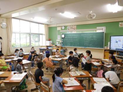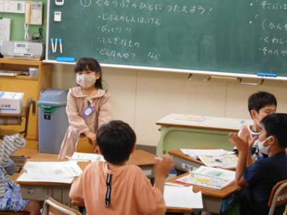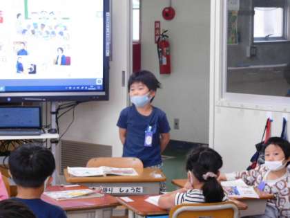 1年生活科です。学校探検で調べたことや気づいたことを発表し合っています。緊張しながらも頑張って発表しています。
