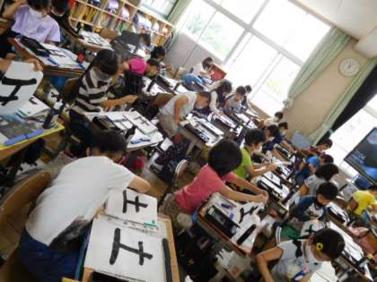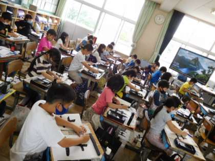 3年書写です。「土」の練習です。完成した清書に名前を書き始めているところです。