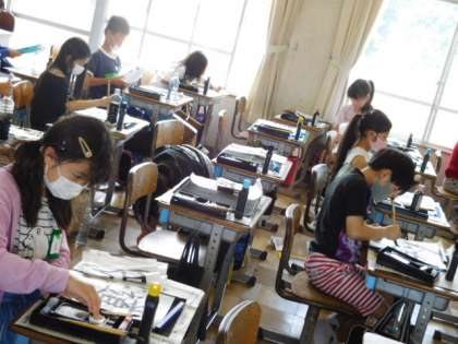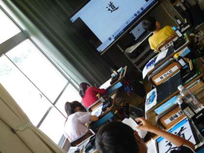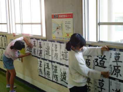 5年書写です。「道」の練習です。清書した作品が廊下に飾られていきます。