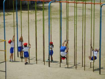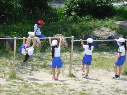 1年体育です。タイヤ跳びや鉄棒、登り棒、うんていなどで、自分の技を磨いています。日に日に上手になっていきます。