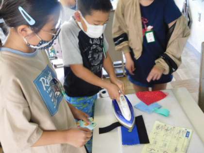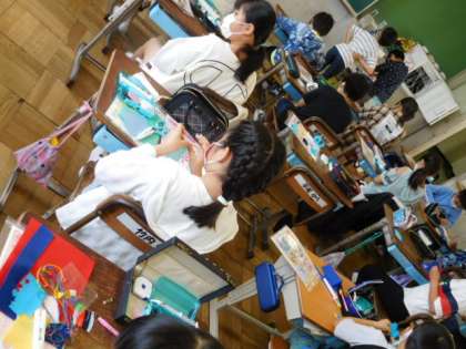 5年家庭科です。フェルト生地を使った小物入れを製作しています。これまで身につけて縫い方を駆使して作品を仕上げます。