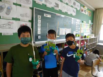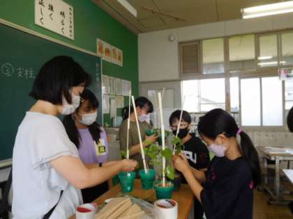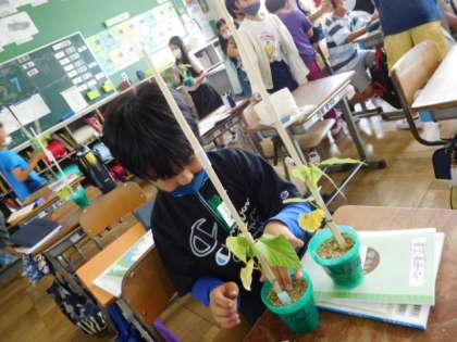 5年理科です。先日苗を植えたインゲンマメが大きくなったので、支柱を立て、肥料をあげています。順調に育っていますね。