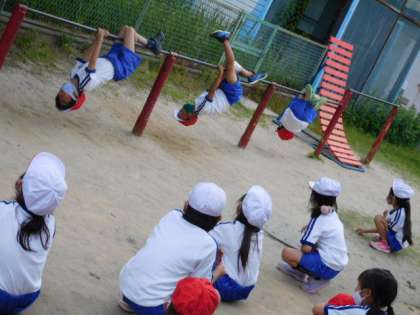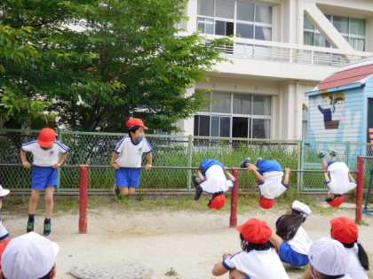 1年体育です。鉄棒の練習です。次から次へと技をこなしていく姿は、頼もしいです。