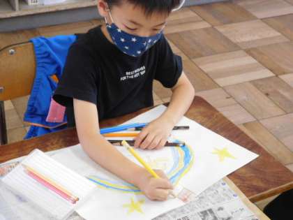 2年図工です。「ふしぎなたまごの」製作がはじまりました。カラフルなたまごから何が出てくるか、完成が楽しみですね。