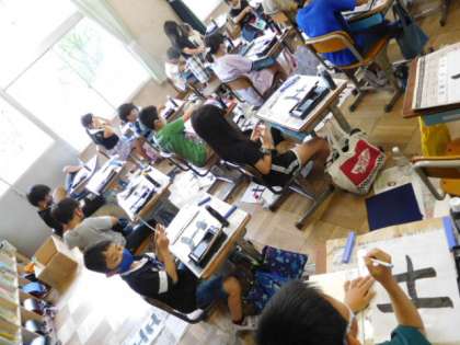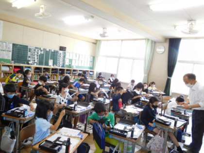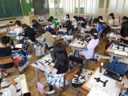 3年書写です。清書を書き終わり、名前を書くところです。先生が作ってくださった手本を参考に丁寧に仕上げています。