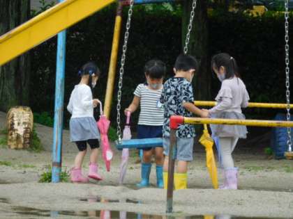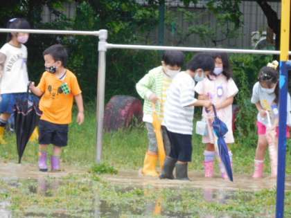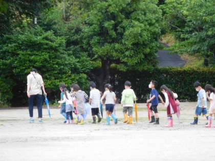 1年生活科です。雨の日の散歩をしています。雨が降った日にはどんな変化があるのか、たくさん発見してくださいね。