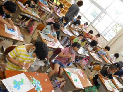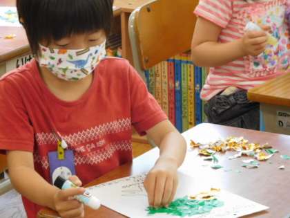 6/9(水)5 公開日 2021/06/09 更新日 2021/06/09 全校 1年図工です。「やぶいたかたちからうまれたよ」折り紙を破いて、その形から発想した絵を作っていきます。今日は破いた紙を乗りで春練習です。