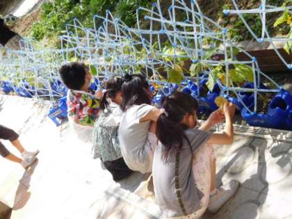 放課に2年生が野菜に水やりをしています。花が咲き終わって小さな実ができているものもあって子どもたちもうれしそうです。