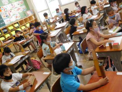 1年算数です。立体模型を使って形の学習をします。日常生活で目にする形と結びつけていきます。