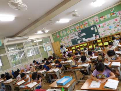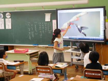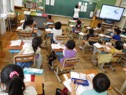 1年国語です。説明文の学習です。繰り返すことで文章の構造を1年生になりにつかみ、分かったことを堂々と発表しています。