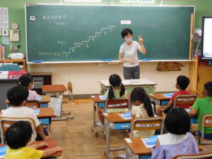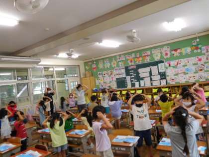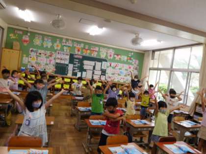 1年音楽です。体を使って「ド・レ・ミ・ファ・ソ・ラ・シ・ド」を表します。音階を自然に学ぶことができますね。