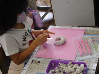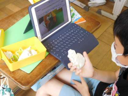 2年図工です。粘土を握って、その形が何に見えるかイメージして、そのイメージしたものを作っていきます。創造力が育まれます。