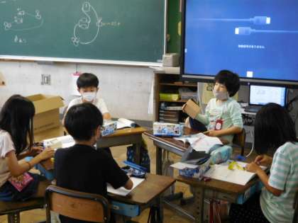 4年理科です。乾電池2個の直列つなぎと並列つなぎで、モーターに流れる電流の大きさを調べています。