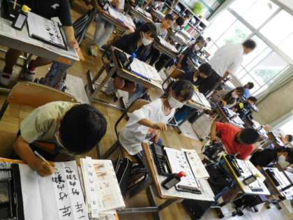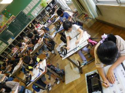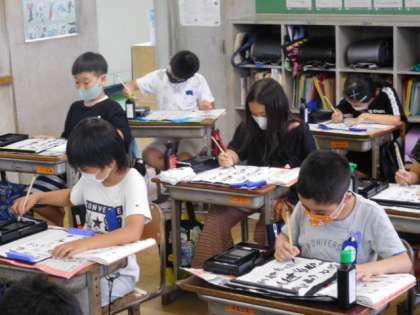 3年書写です。小筆を使って名前を書く練習です。名前も作品の一部なのでうまく書きたいですね。