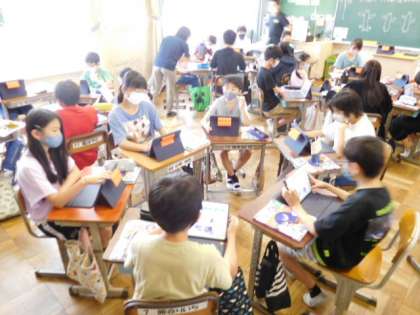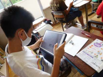 6年理科です。根から吸い込まれた水が、植物の体をどのように通っていくか、今まで学習したことを生かして仮説を立てています。
