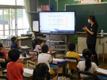 2年音楽です。「こいぬのビンゴ」という曲で、リズムを取る練習をしています。みんなノリノリです。