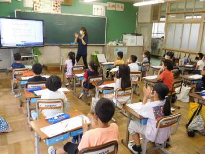 2年音楽です。「こいぬのビンゴ」という曲で、リズムを取る練習をしています。みんなノリノリです。