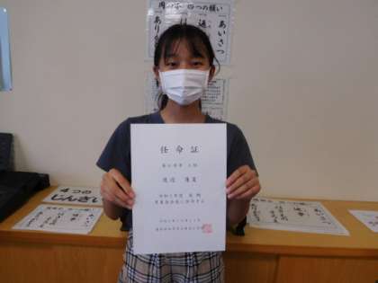 昨日、任命式にお休みだった児童会長さんに任命証を渡しました。任命賞を受け取るときの表情から、学校の代表として力を尽くしたいという強い決意が伝わってきました。よろしくお願いします。