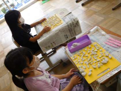 図工です。細かくちぎった粘土を集めて、固めながらサイコロの形を作っています。粘土を使いこなす練習です。