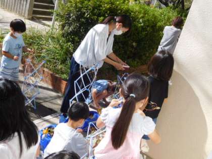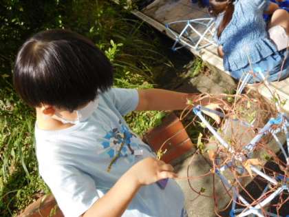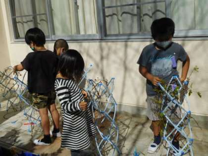10/14(木) 1年生 公開日 2021/10/14 更新日 2021/10/14 1年生 生活科です。アサガオが咲き終わり、種も収穫できたので、つるを支柱から取っています。この後、集めたつるでリースを作ります。