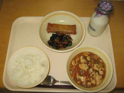 今日の献立は ごはん・ぎゅうにゅう はるまき マーボどうふ やさいのひじきあえ です。