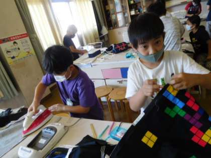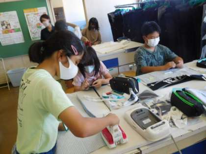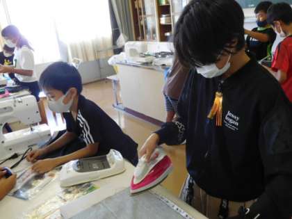 家庭科です。エプロンの製作です。家庭科室で、折り線に沿ってアイロンをかけたり、なみ縫いで、しつけをしたりする作業を行っています。