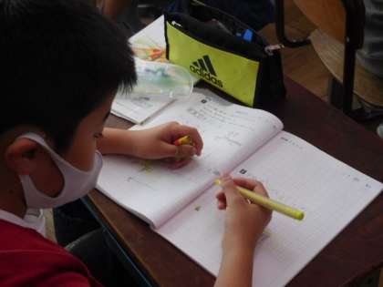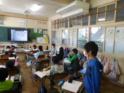 10/19(火) 3年生 公開日 2021/10/19 更新日 2021/10/19 3年生 算数です。「何倍でしょう」という学習です。「あめが、ふくろに6こ、かんに30こ入っています。かんは、ふくろの何倍はいっていますか」という問題について、式の立て方、答えの出し方を考えています。