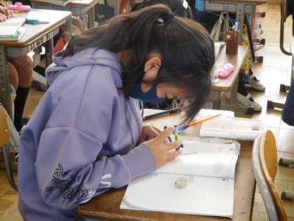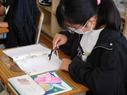 算数です。図形の拡大・縮小の学習です。実際にコンパス、分度器を使って、もとになる四角形を2倍に拡大した図を描くことに挑戦しています。