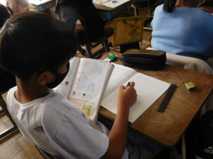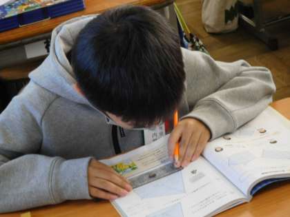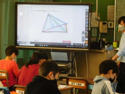 10/26(火) 5年生 公開日 2021/10/26 更新日 2021/10/26 5年生 算数です。多角形の面積をこれまで学習した三角形の面積の公式を使って解いています。補助線をどのように引きかが重要です。