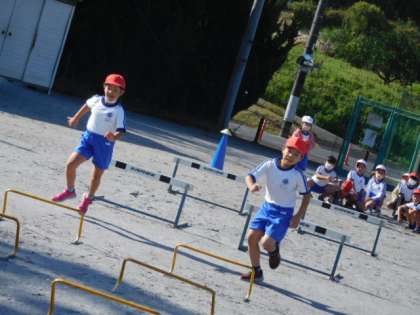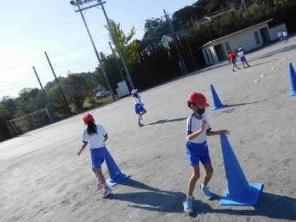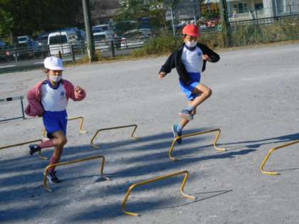 10/26(火) 2年生 公開日 2021/10/26 更新日 2021/10/26 2年生 体育です。障害走の授業です。ハードル、ミニh-ドル、マーカー、カラーコーンと次々に乗り越えてゴールを目指します。