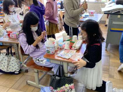 10/28(木) 授業風景 2年生 公開日 2021/10/28 更新日 2021/10/28 全校 2年生は、おもちゃ作りに一生懸命です。友達と相談しながら、より楽しめるおもちゃになるように工夫していました。