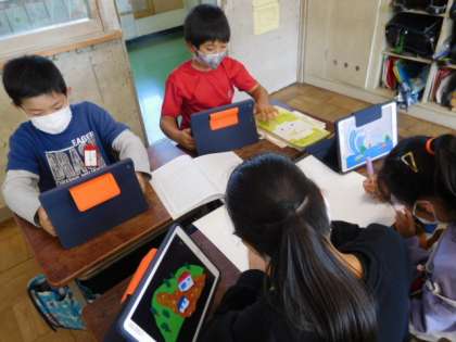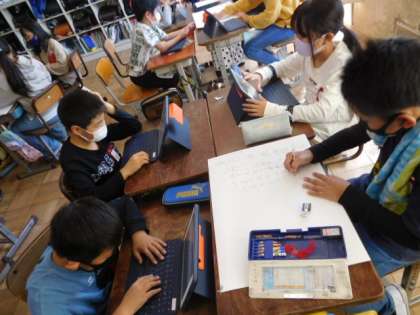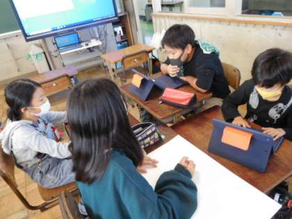 10/28(木) 4年生 公開日 2021/10/28 更新日 2021/10/28 4年生 社会です。東日本大震災について調べたことをグループでまとめています。役割分担をして調べたことがしっかり伝わるように話し合って進めています。