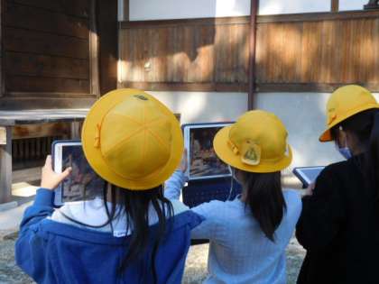 10/29(金) 2年生 公開日 2021/10/29 更新日 2021/10/29 2年生 2年生は、書画写真展の作品を描くために、慈雲寺に出かけました。今日は、どの場所を絵に描くか決め、タブレット端末に画像で保存しました。厳かな雰囲気に包まれ、手を合わせてお祈りをする子どもたちもいました。