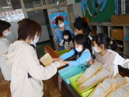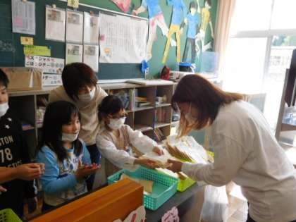 先生方がお客さんです。「いらっしゃいませ」「おすすめは○○です」「おつりは△円です」「ありがとうございました」など、子どもたちは店員さんになりきって上手に販売することができました。
