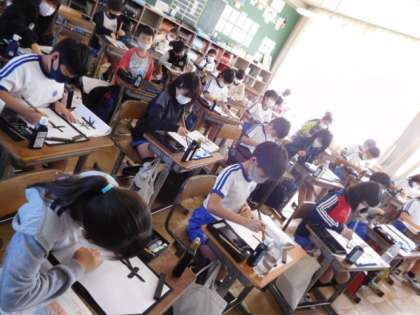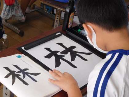 11/5(金) 4年生 公開日 2021/11/05 更新日 2021/11/05 4年生 書写です。「林」の練習が始まりました。1文字ですが、左右のバランスを取るのが難しい字です。手本をしっかり見て取り組んでいます。