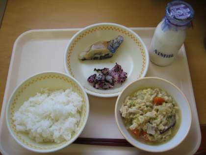 11/8(月) 給食 公開日 2021/11/08 更新日 2021/11/08 給食 今日の献立は ごはん・ぎゅうにゅう さわらのさいきょうやき こうやどうふのたまごとじ はくさいのゆかりあえ です。
