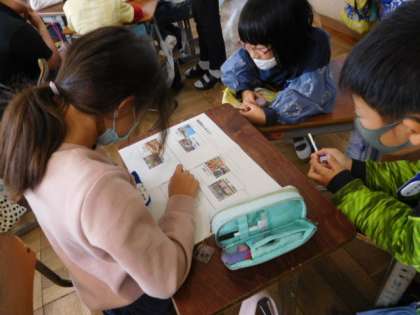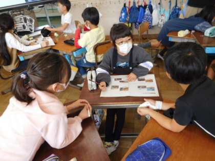 総合的な学習です。岡田博士になるために、岡田にある小型商店のよさをみんなで話し合っています。社会で学習したスーパーマーケットの学習を生かし、大きさ、種類、値段、施設設備の観点から意見Bんを交わしています。