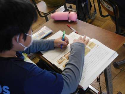 国語です。「『鳥獣戯画』を読む」の学習です。作者が読んでいる人の興味を引いたり、わかりやすく説明するために工夫しているところを読み取っています。